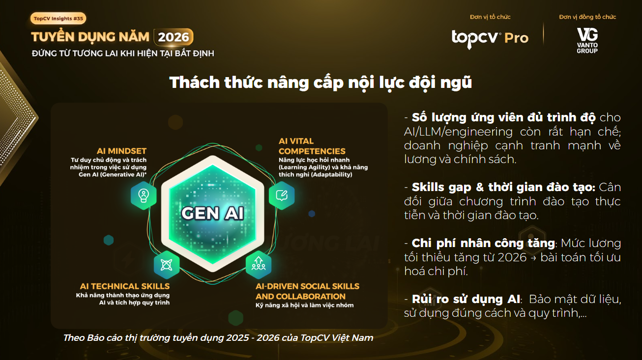 Trước hết, nguồn ứng viên đủ trình độ cho các vị trí liên quan đến AI, LLM và kỹ thuật vẫn còn hạn chế, trong khi doanh nghiệp phải cạnh tranh ngày càng gay gắt về mức lương và chính sách đãi ngộ để thu hút nhân sự phù hợp.