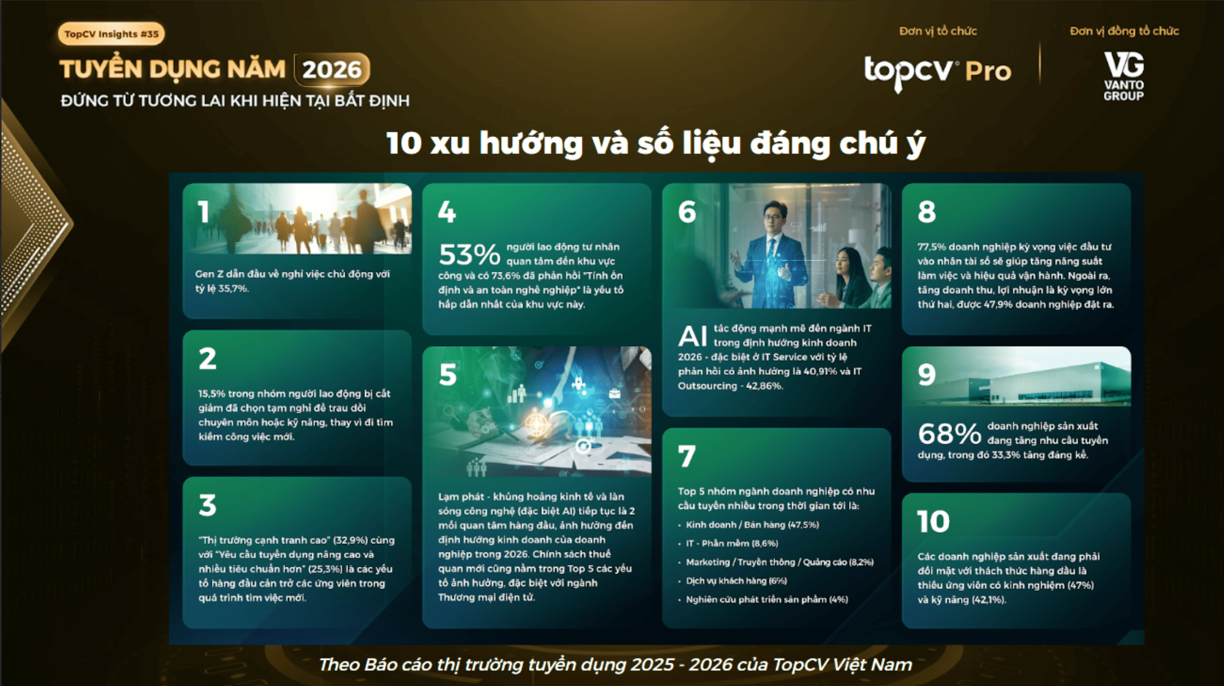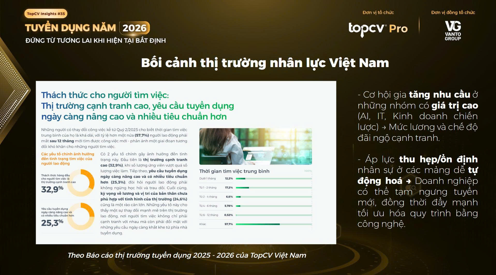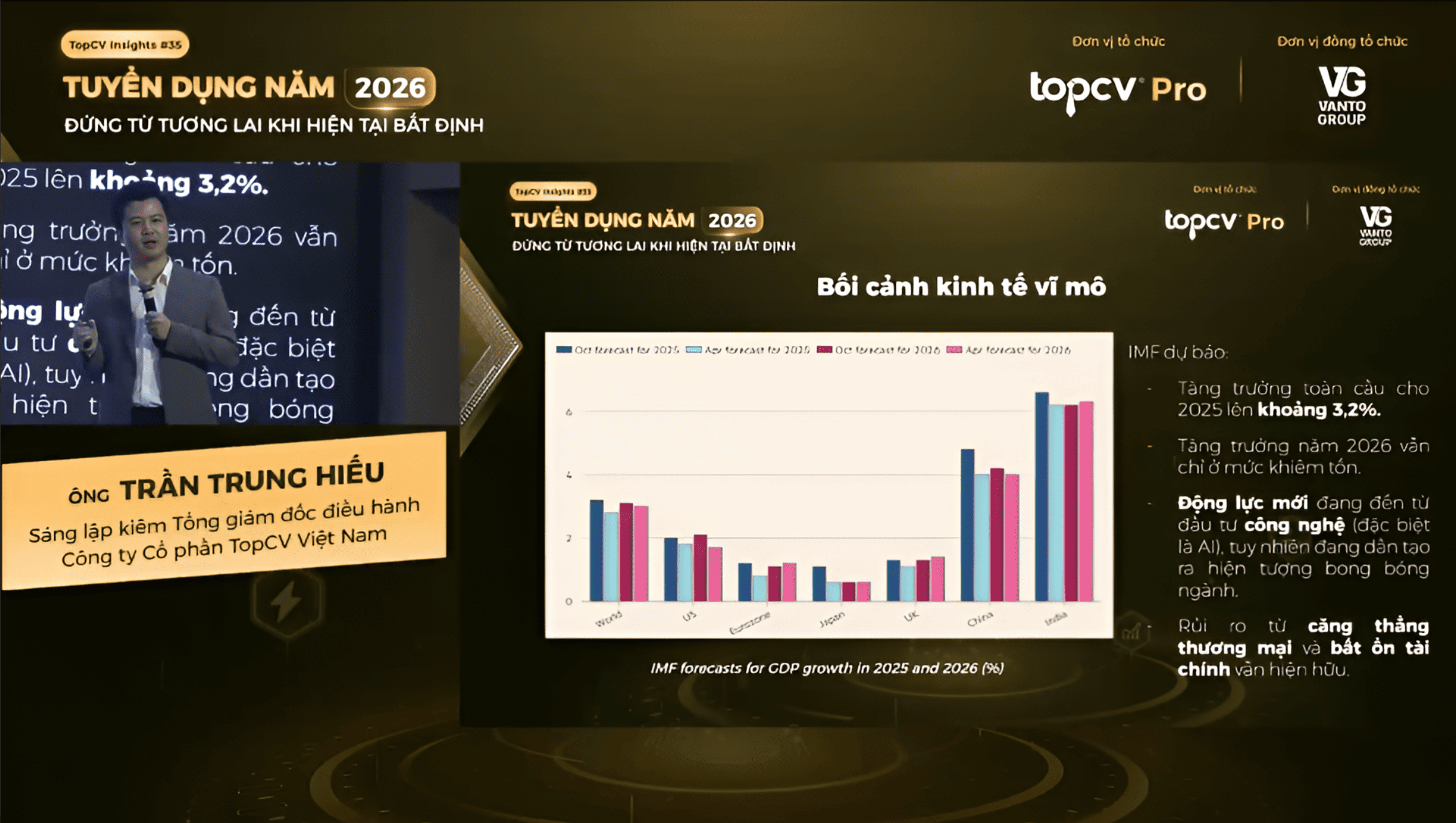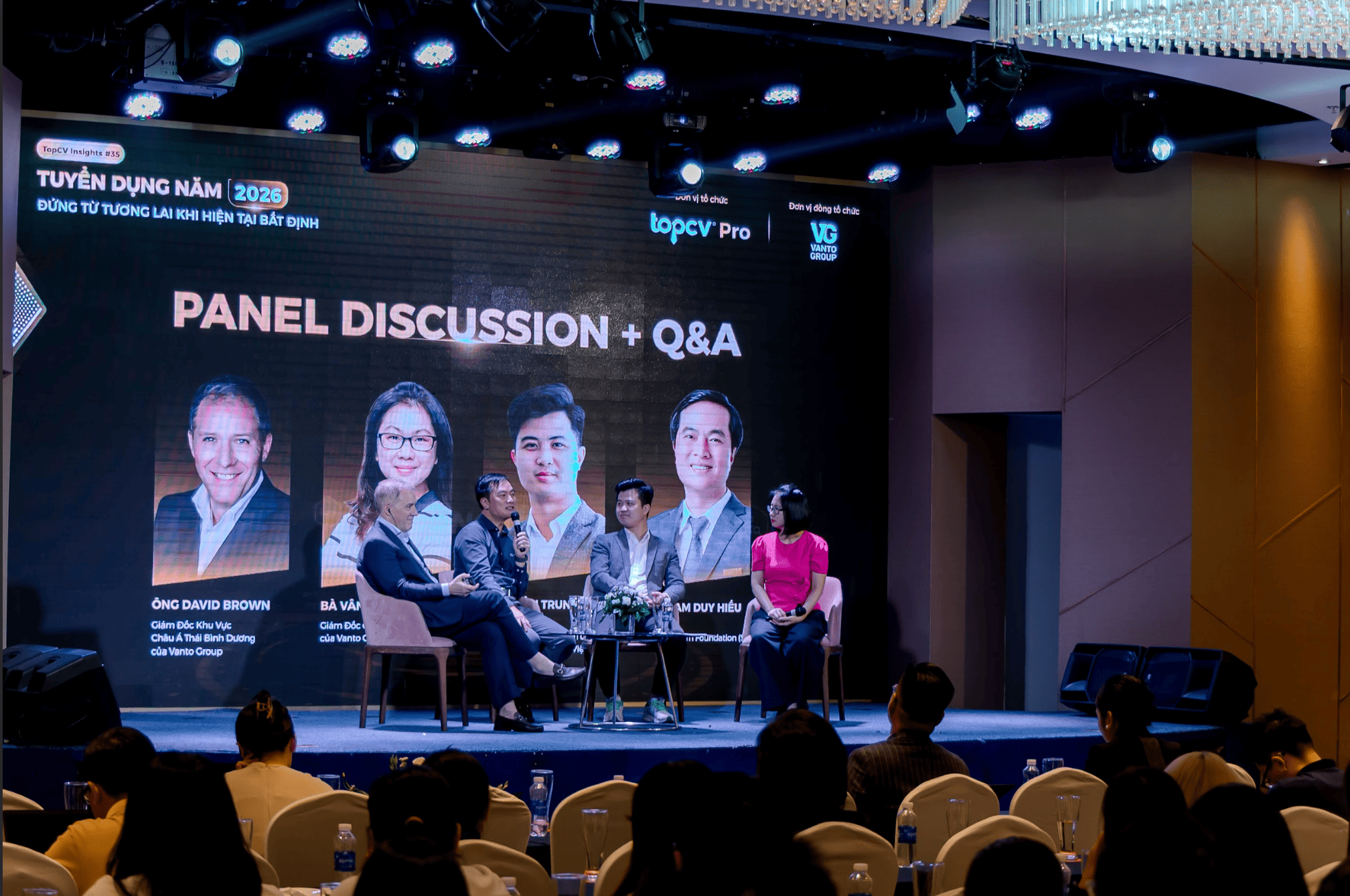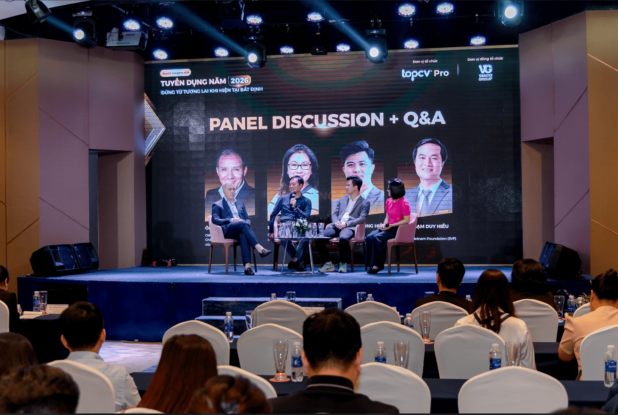 Bài toán đặt ra cho người quản lý nhân sự lúc này không phải là “săn người” bằng mọi giá, mà là quay về tối ưu hóa nội lực và tái thiết một mô hình tuyển dụng Tinh gọn – Linh hoạt – Bền vững. Tại sự kiện TopCV Insights #35: Tuyển dụng năm 2026: Đứng từ tương lai khi hiện tại bất định diễn ra ngày 05/12 vừa qua, với 150 khách mời bao gồm lãnh đạo doanh nghiệp, CHROs, HR Directors, HR Managers và nhiều chuyên gia nhân sự đã cùng thảo luận chuyên sâu về chủ đề này. Sự kiện mang đến bức tranh kinh tế toàn cầu dựa trên dữ liệu của Quỹ Tiền tệ Quốc tế, phân tích tác động đến cung – cầu nguồn nhân lực Việt Nam năm 2026, kết hợp case study thực tế và định hướng nâng cấp nội lực đội ngũ theo hướng dữ liệu, hiệu suất và bền vững.