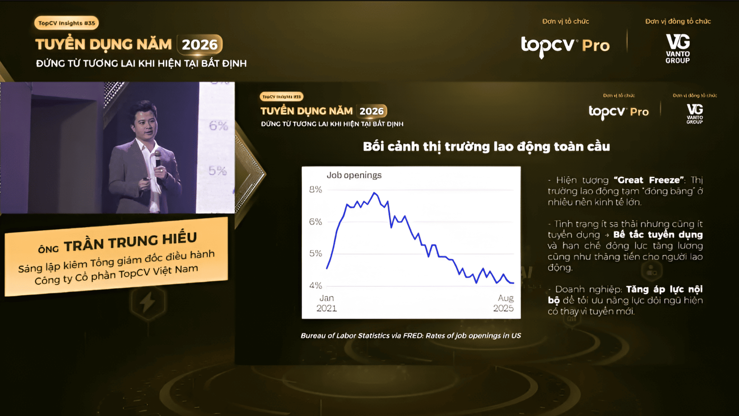 Không phải làn sóng lay-off, các dữ liệu mới từ thị trường lao động lại chỉ ra một trạng thái đáng lo ngại hơn: “The Great Freeze” – Cơn Đóng Băng Lớn. Khi tỷ lệ sa thải giảm nhưng tuyển dụng cũng chạm đáy, thị trường không sụp đổ mà rơi vào trạng thái đứng yên, âm thầm bào mòn nội lực doanh nghiệp. Cùng bàn luận về vấn đề này với các phiên thảo luận chuyên sâu tại Hội thảo TopCV Insights #35: Tuyển dụng 2026 – Đứng từ tương lai khi hiện tại bất định dưới đây.