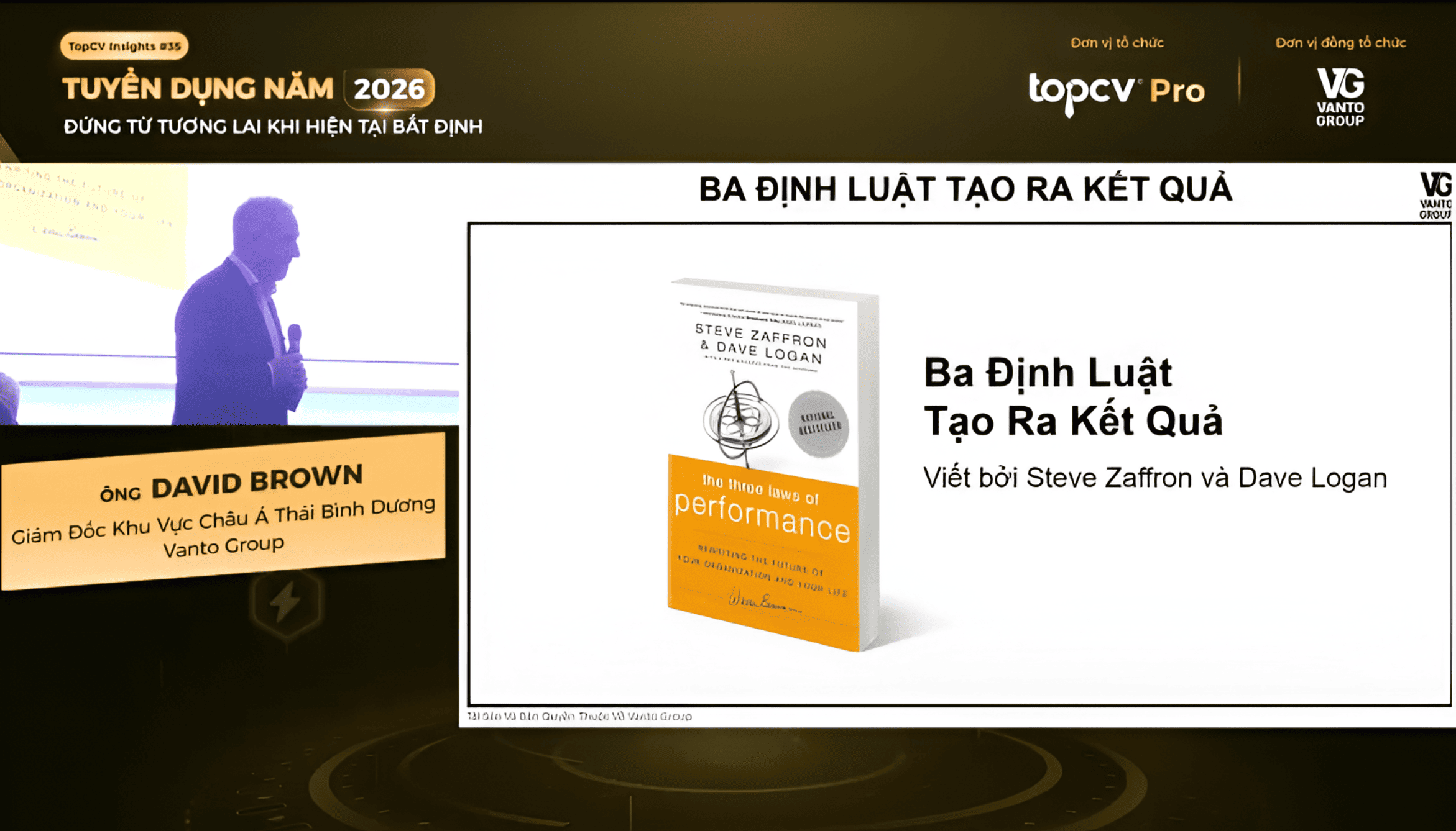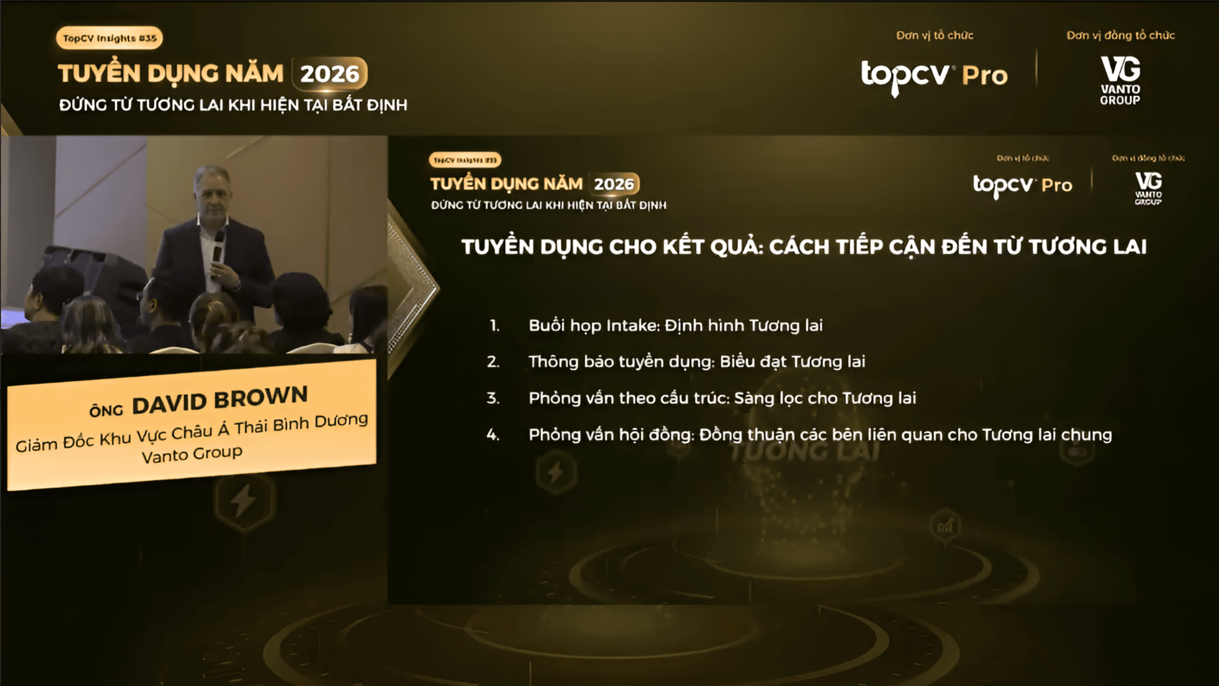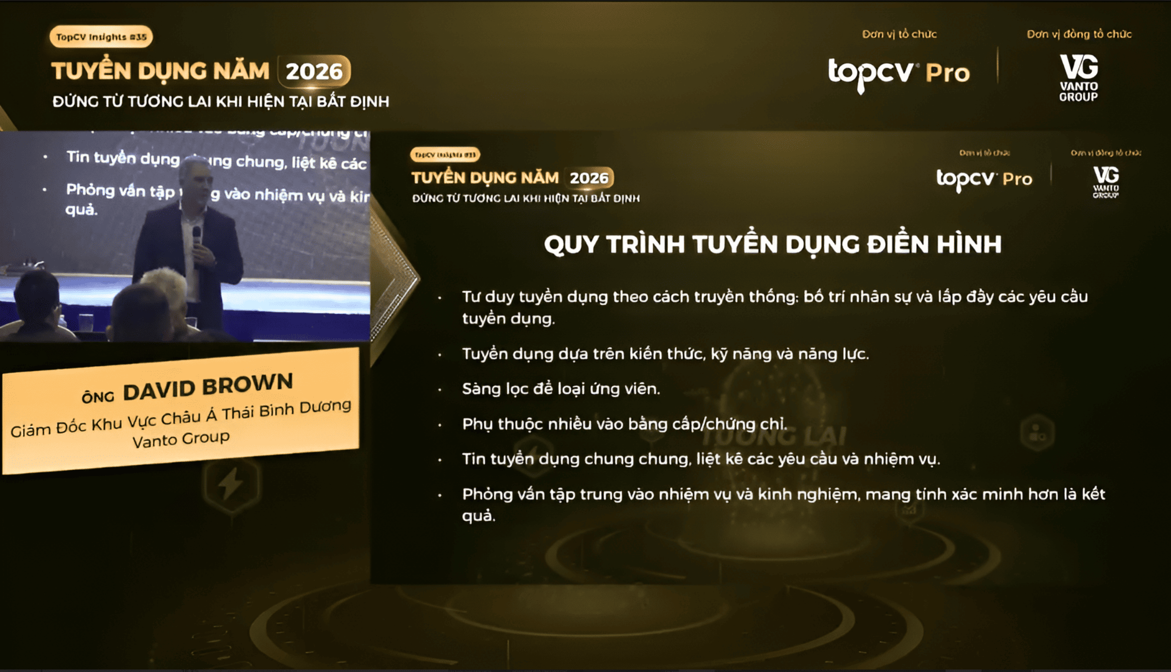 Trong phần chia sẻ của ông David Brown và bà Vân Nguyễn, đại diện Vanto Group mang đến một góc nhìn khác về tuyển dụng, nhấn mạnh rằng hoạt động này cần được thiết kế xoay quanh hiệu suất (performance) và kết quả (outcome).